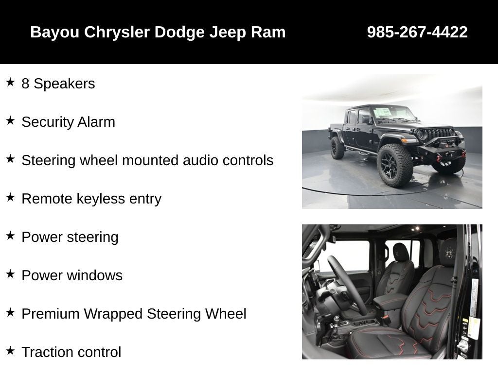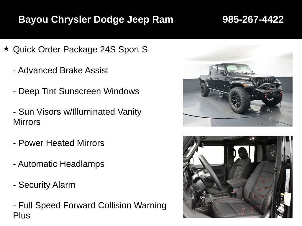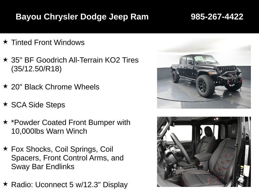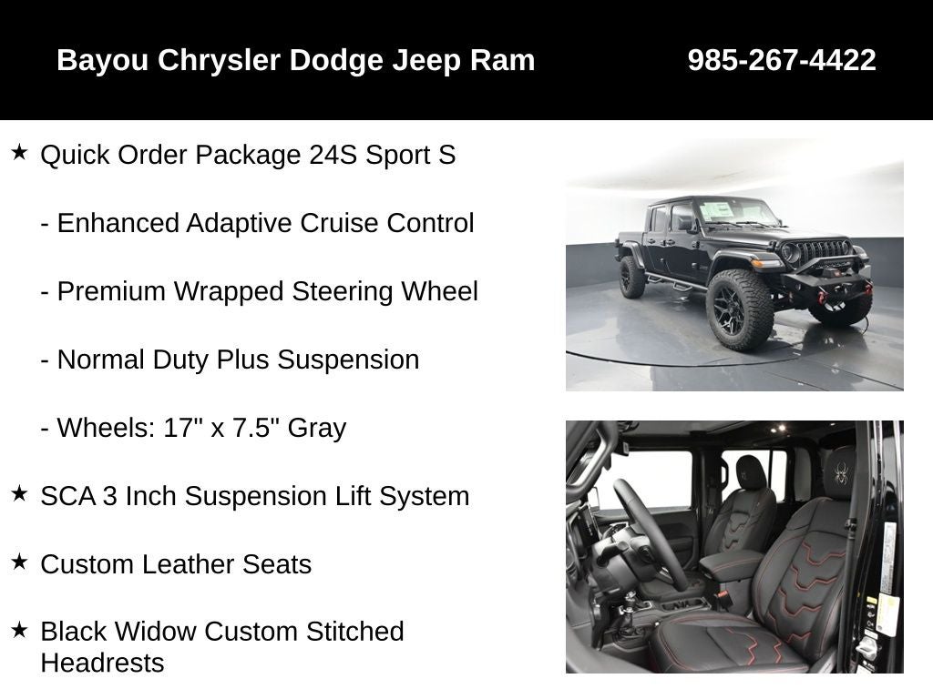 SCA 3 Inch Suspension Lift System, Custom Leather Seats, Black Widow Custom Stitched Headrests, Red LED Interior Lighting, Tinted Front Windows, 35 BF Goodrich All-Terrain KO2 Tires (35/12.50/R18), 20 Black Chrome Wheels, SCA Side Steps, *Powder Coated Front Bumper with 10,000lbs Warn Winch, Fox Shocks, Coil Springs, Coil Spacers, Front Control Arms, and Sway Bar Endlinks, Gladiator Sport S SCA Black Widow, 4D Crew Cab, 3.6L V6 24V VVT, 8-Speed Automatic, 4WD, Black Clearcoat, Black w/Cloth Low-Back Bucket Seats, 8 Speakers, ABS brakes, Advanced Brake Assist, Air Conditioning, Apple CarPlay/Android Auto, Automatic Headlamps, Body Color 3-Piece Hard Top, Compass, Deep Tint Sunscreen Windows, Dual front impact airbags, Dual front side impact airbags, Electronic Stability Control, Freedom Panel Storage Bag, Full Speed Forward Collision Warning Plus, Illuminated entry, Low tire pressure warning, Normal Duty Plus Suspension, ParkView Rear Back-Up Camera, Power Heated Mirrors, Power steering, Power windows, Premium Wrapped Steering Wheel, Quick Order Package 24S Sport S, Radio: Uconnect 5 w/12.3 Display, Rear Sliding Window, Rear Window Defroster, Remote keyless entry, Security Alarm, Steering wheel mounted audio controls, Sun Visors w/Illuminated Vanity Mirrors, Traction control.