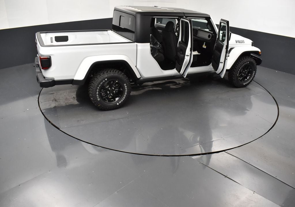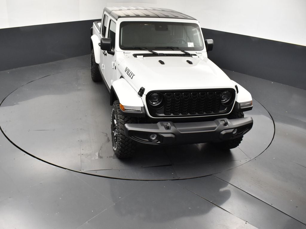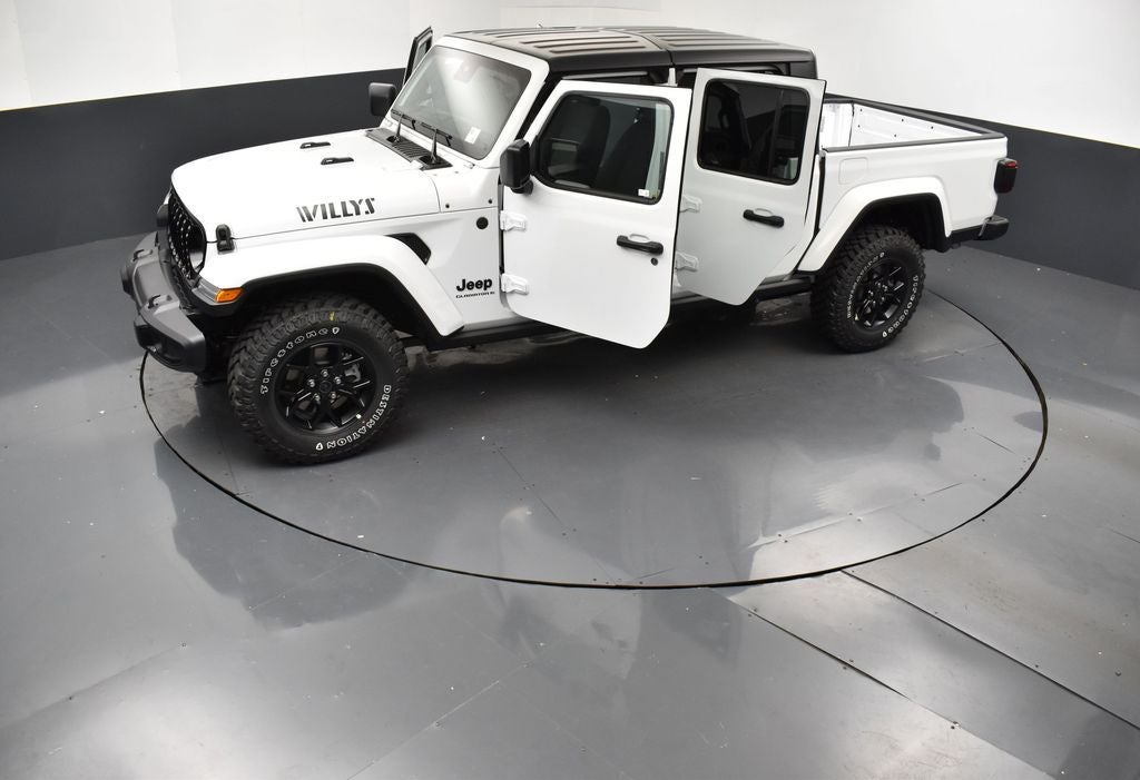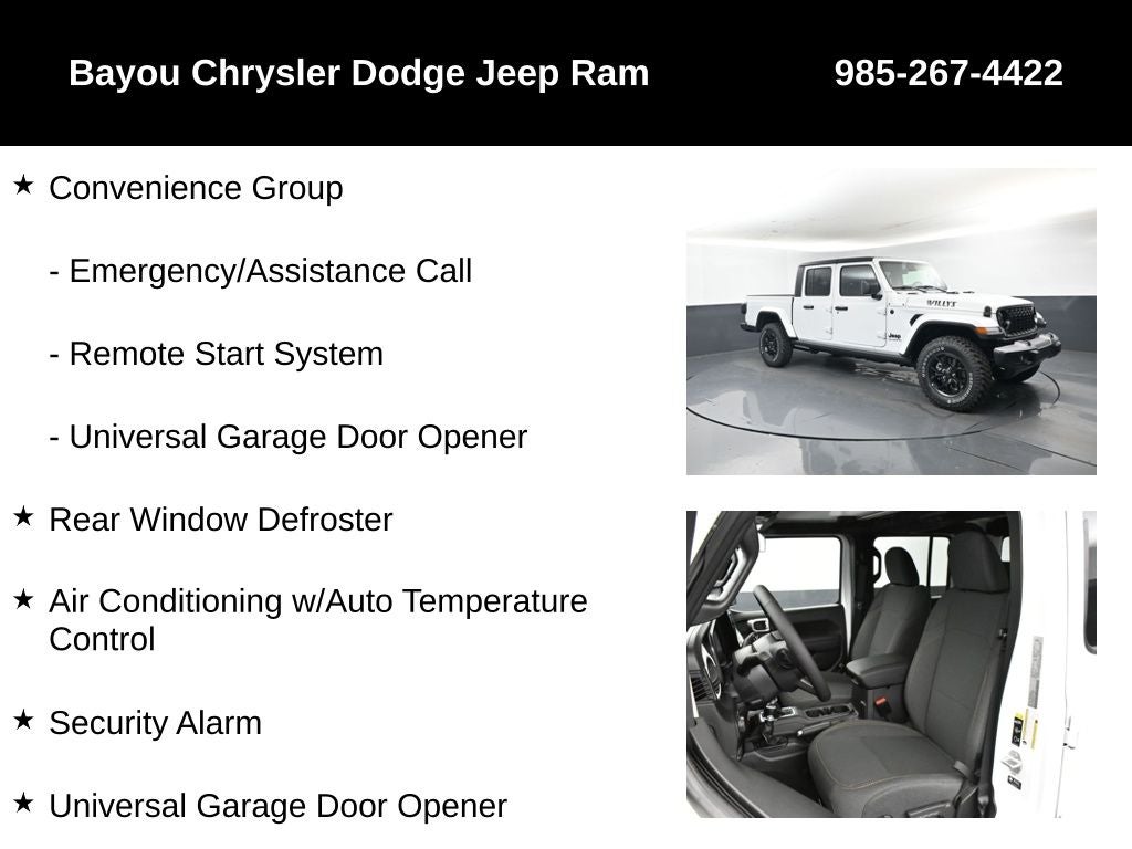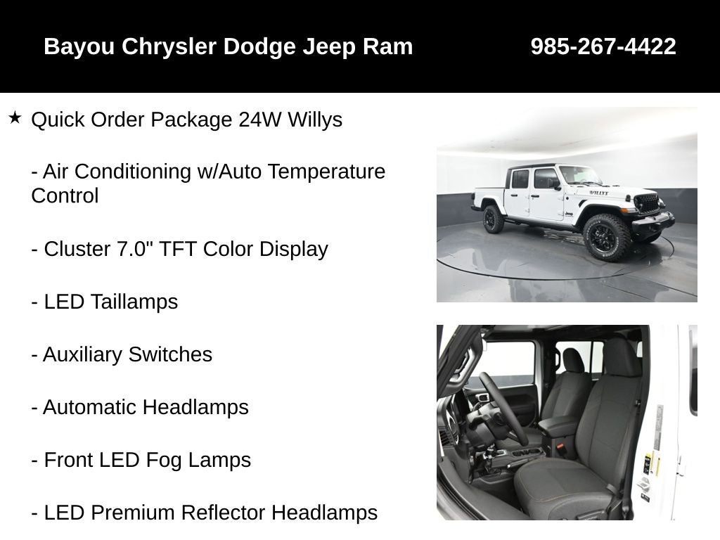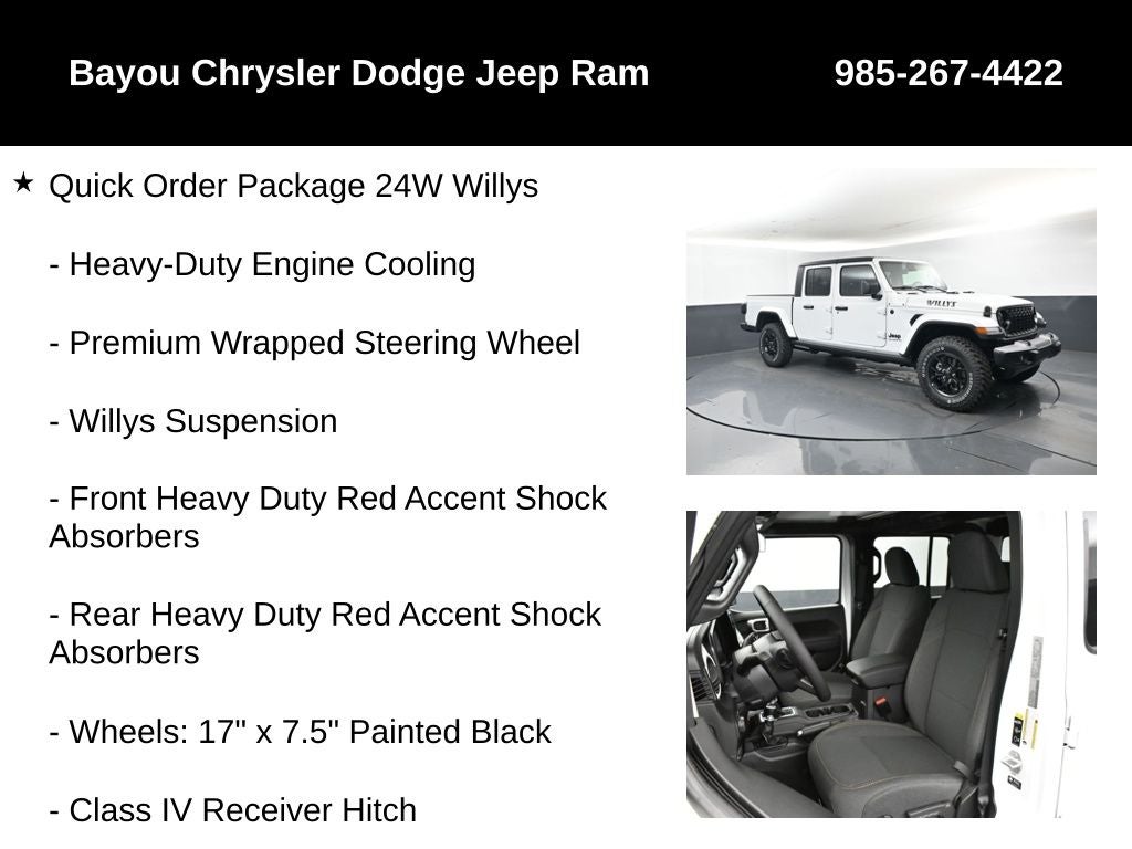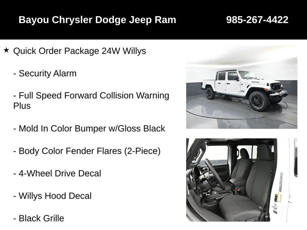 Gladiator Willys, 4D Crew Cab, 3.6L V6 24V VVT, 8-Speed Automatic, 4WD, Bright White Clearcoat, Black Cloth, 4-Wheel Disc Brakes, 4-Wheel Drive Decal, ABS brakes, Advanced Brake Assist, Air Conditioning w/Auto Temperature Control, Apple CarPlay/Android Auto, Automatic Headlamps, Auxiliary Switches, Black 3-Piece Hard Top, Black Grille, Body Color Fender Flares (2-Piece), Class IV Receiver Hitch, Cluster 7.0 TFT Color Display, Convenience Group, Corning Gorilla Glass, Daytime Running Lamp System, Daytime Running Lamps LED Accents, Deep Tint Sunscreen Windows, Dual front impact airbags, Dual front side impact airbags, E-Locker Rear Axle, Emergency/Assistance Call, Enhanced Adaptive Cruise Control, Freedom Panel Storage Bag, Front Door Locks 2-Door Passive Entry, Front Heavy Duty Red Accent Shock Absorbers, Front LED Fog Lamps, Full Speed Forward Collision Warning Plus, Heated Front Seats, Heated Steering Wheel, Heavy-Duty Engine Cooling, LED Premium Reflector Headlamps, LED Taillamps, Mold In Color Bumper w/Gloss Black, MOPAR All-Weather Slush Mats, Off-Road Plus Mode, Outside temperature display, Panic alarm, ParkView Rear Back-Up Camera, Power Heated Mirrors, Power steering, Power windows, Premium Wrapped Steering Wheel, Protection Sill Rails, Quick Order Package 24W Willys, Rear Heavy Duty Red Accent Shock Absorbers, Rear Sliding Window, Rear Window Defroster, Remote keyless entry, Remote Start System, Security Alarm, Speed control, Steering wheel mounted audio controls, Sun Visors w/Illuminated Vanity Mirrors, Trailer Hitch Zoom, Universal Garage Door Opener, Wheels: 17 x 7.5 Painted Black, Willys Hood Decal, Willys Suspension.