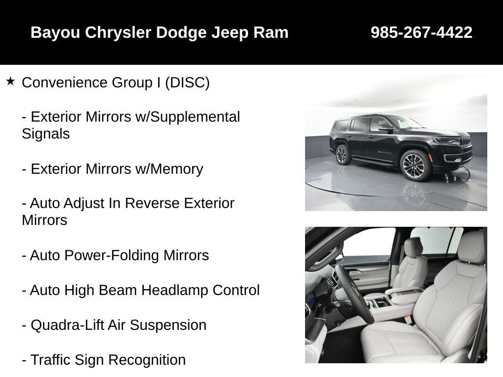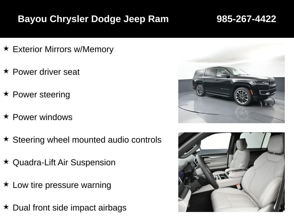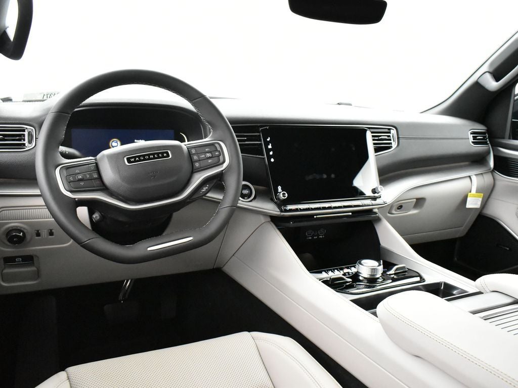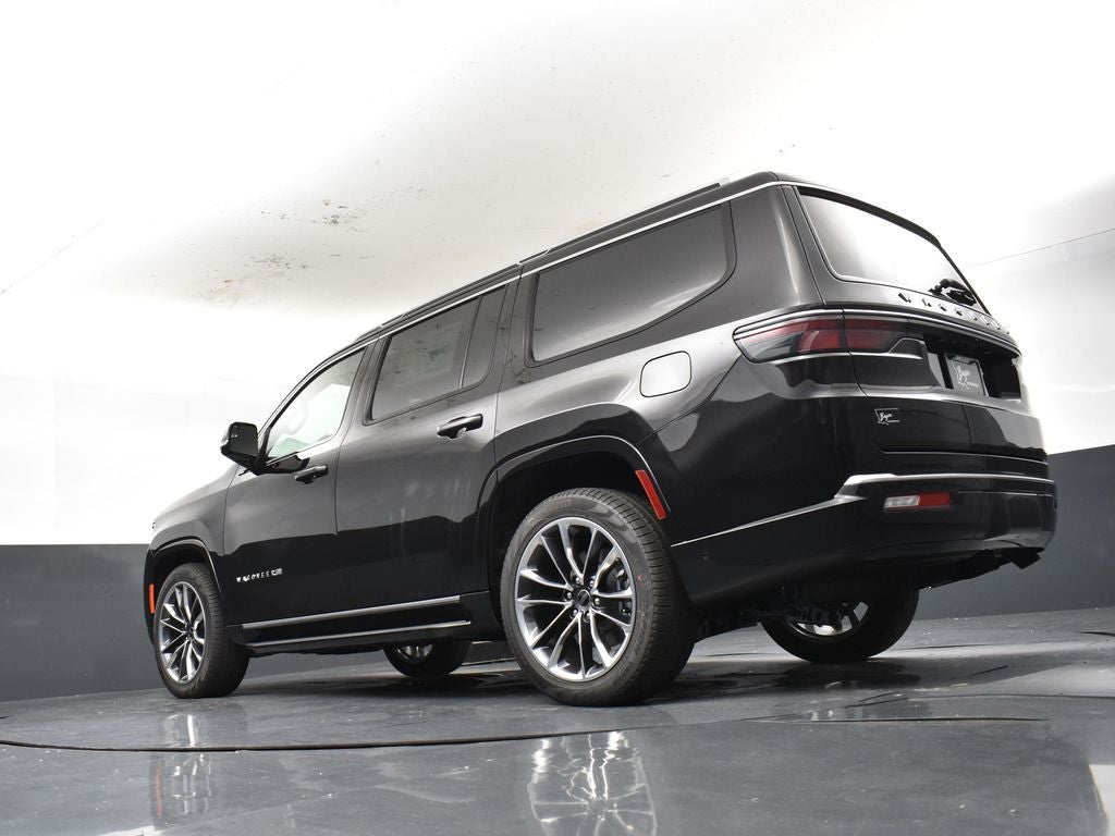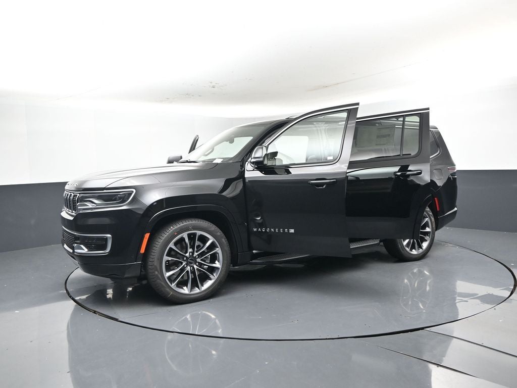 Wagoneer Series II, 4D Sport Utility, 3.0L I6, 8-Speed Automatic, 4WD, Diamond Black Crystal Pearlcoat, Global Black w/Leather Trimmed Bucket Seats, 10 Speakers, 2nd Row Manual Window Shades, 3 Panel Sunroof, 4-Wheel Disc Brakes, ABS brakes, Adjustable Roof Rail Crossbars, Air Conditioning, Alloy wheels, Apple CarPlay/Android Auto, Auto Adjust In Reverse Exterior Mirrors, Auto High Beam Headlamp Control, Auto Power Folding Exterior Mirrors, Auto Power-Folding Mirrors, Auto-Dimming Exterior Driver Mirror, Cargo Cover, Convenience Group I (DISC), Drowsy Driver Detection, Dual front impact airbags, Dual front side impact airbags, Exterior Mirrors Approach Lamps, Exterior Mirrors w/Memory, Exterior Mirrors w/Supplemental Signals, Heads-Up Display, Heated Exterior Mirrors, Heated front seats, Intersection Collision Assist System, Low tire pressure warning, P&P Park & Unpark Assist w/Stop System, Panic alarm, ParkView Rear Back-Up Camera, Power driver seat, Power Liftgate, Power steering, Power windows, Premium Group I, Quadra-Lift Air Suspension, Quick Order Package 25J, Radio: Uconnect 5 Nav w/10.1 Display, Rear air conditioning, Reversible Carpet/Vinyl Cargo Mat, Semi Active Damping, Side Distance Warning, Speed control, Steering wheel mounted audio controls, Surround View Camera System, Traffic Sign Recognition, Wheels: 22 x 9.0 Premium 3 Aluminum.