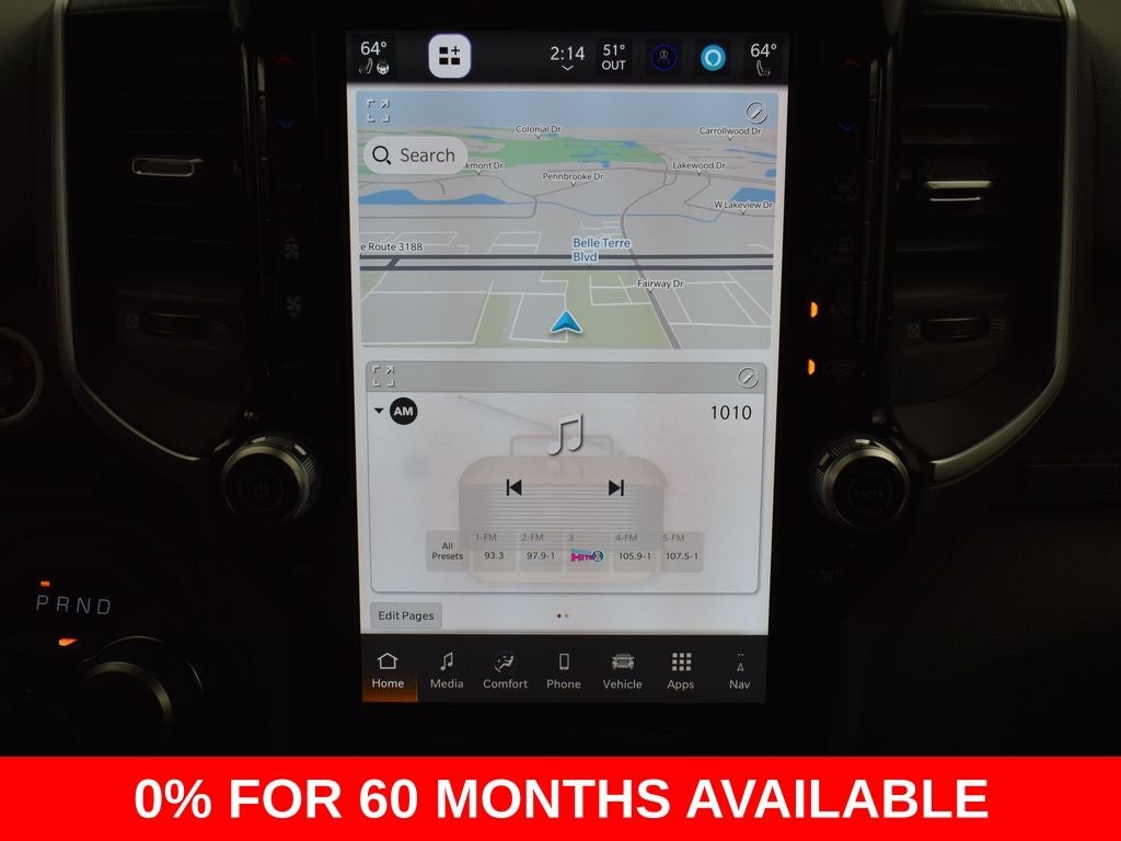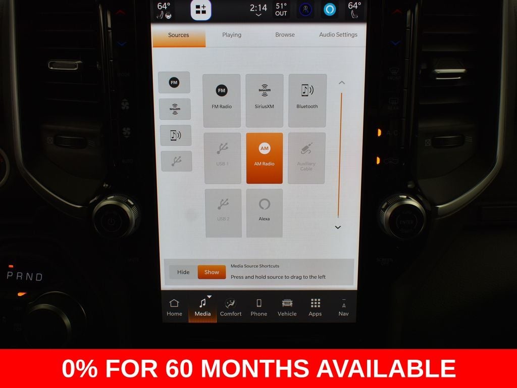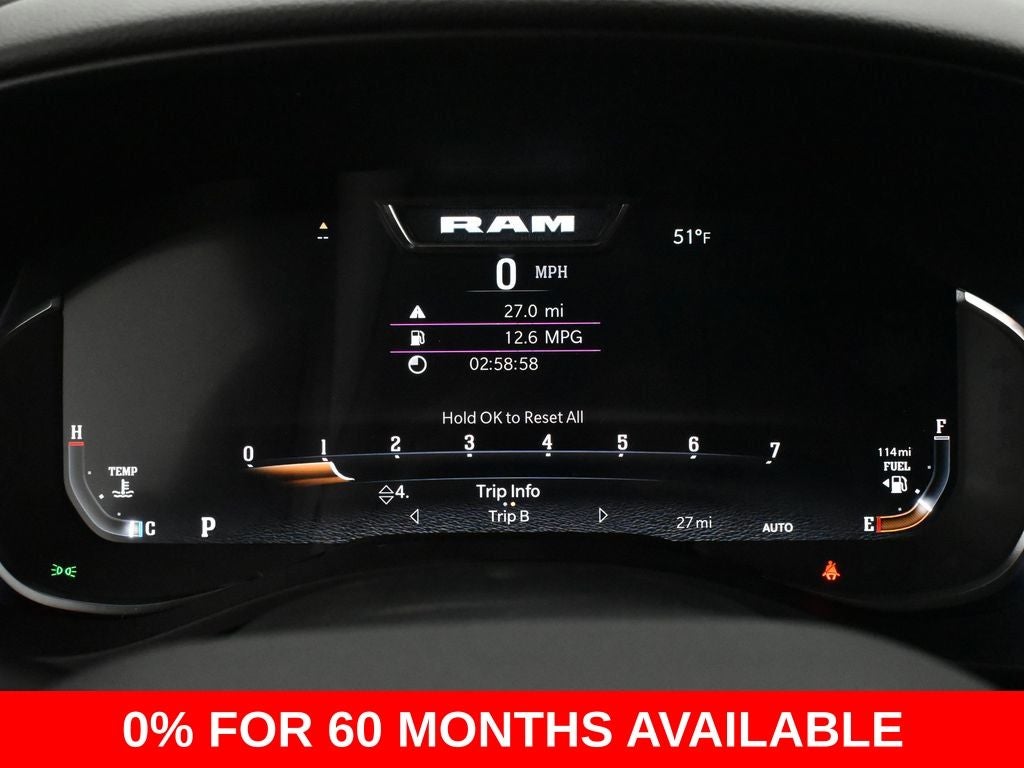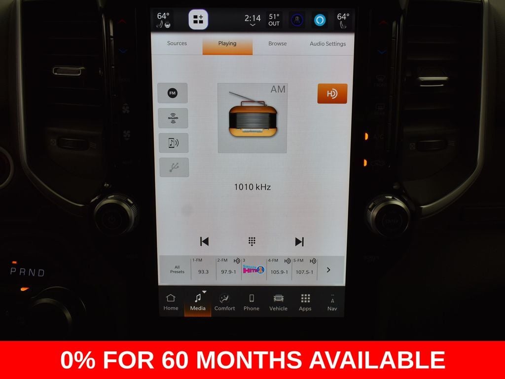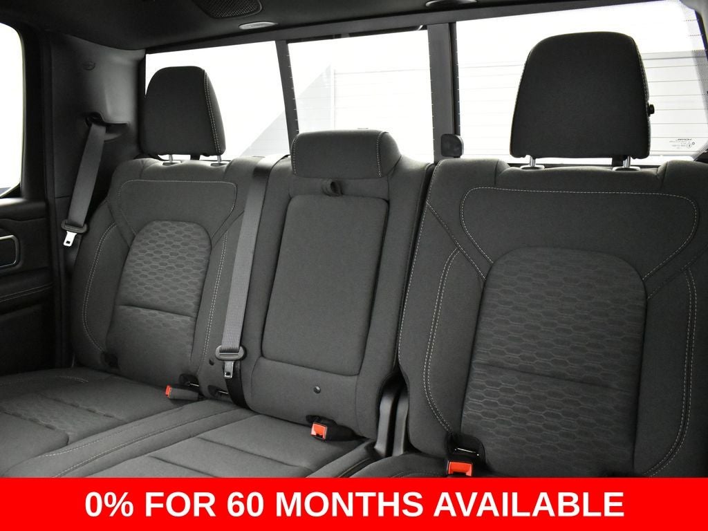 1500 Big Horn/Lone Star, 4D Crew Cab, HEMI 5.7L V8 Multi Displacement VVT eTorque, 8-Speed Automatic, 4WD, Bright White Clearcoat, Black w/Deluxe Cloth Bucket Seats, 115V Auxiliary Power Outlet, 115V Auxiliary Rear Power Outlet, 12 Touchscreen Display, 2nd Row In Floor Storage Bins, 3 Rear Seat Head Restraints, 4 Way Front Headrests, 4-Wheel Disc Brakes, 400W Inverter, 4G LTE Wi-Fi Hot Spot, 9 Amplified Speakers w/Subwoofer, ABS brakes, Accent Color Door Handles, Accent Color Premium Power Mirrors, Accent Color Tailgate Handle, Air Conditioning ATC w/Dual Zone Control, Alloy wheels, Anti-Spin Differential Rear Axle, Apple CarPlay, Auto Power-Folding Mirrors, Auto-Dimming Exterior Driver Mirror, Auto-Dimming Rear-View Mirror, Big Horn Level 2 Equipment Group, Black Exterior Mirrors, Black Exterior Truck Badging, Black Headlamp Bezels, Black Interior Accents, Black Painted Exterior Mirrors Caps, Black Premium Power Mirrors, Black Tail Lamp Bezels, Body Color Fender Flares, Body Color Front Bumper, Body Color Rear Bumper w/Step Pads, Bucket Seats, Center Console Parts Module, Cluster 7.0 TFT Color Display, Configurable Drive Mode, Connected Travel & Traffic Services, Connectivity - US/Canada, Convex Wide-Angle Exterior Mirror Insert, Deluxe Cloth Bucket Seats, Disassociated Touchscreen Display, Dual Exhaust w/Black Tips, Dual front impact airbags, Dual front side impact airbags, Exterior Mirrors Courtesy Lamps, Exterior Mirrors w/Heating Element, Exterior Mirrors w/Supplemental Signals, Front Seat Back Map Pockets, Full Length Floor Console, Global Telematics Box Module (TBM), Glove Box Lamp, Google Android Auto, GPS Antenna Input, GPS Navigation, Grille Black Surround Black Mesh, HD Radio, Heated Front Seats, Heated Steering Wheel, Integrated Center Stack Radio, Integrated Voice Command w/Bluetooth®, Leather Wrapped Steering Wheel, LED Dome Lamp w/On/Off Switch, LED Footwell Lighting, Low tire pressure warning, Manual Adjust 4-Way Front Passenger Seat, Media Hub w/2 Charge Only USBs, Mopar Black Tubular Side Steps, Night Edition, Outside temperature display, Overhead LED Lamps, Panic alarm, ParkView Rear Back-Up Camera, Power 2-Way Driver Lumbar Adjust, Power Adjust 8-Way Driver Seat, Power Adjustable Pedals, Power door mirrors, Power steering, Power windows, Premium Overhead Console, Quick Order Package 27Z Big Horn, Radio: Uconnect 5 Nav w/12.0 Display, RAM Grille Badge - Black, Rear 60/40 Folding Seat, Rear Center Armrest, Rear Power Sliding Window, Rear Window Defroster, Remote keyless entry, Remote Tailgate Release, Security Alarm, SiriusXM Radio Service, SiriusXM w/360L, Speed control, Steering Wheel Mounted Audio Controls, Sun Visors w/Illuminated Vanity Mirrors, Tilt steering wheel, Universal Garage Door Opener, USB Host Flip, Wheels: 20 x 9.0 Aluminum Painted Clad, Wheels: 20 x 9 Aluminum Chrome Clad (WRK).