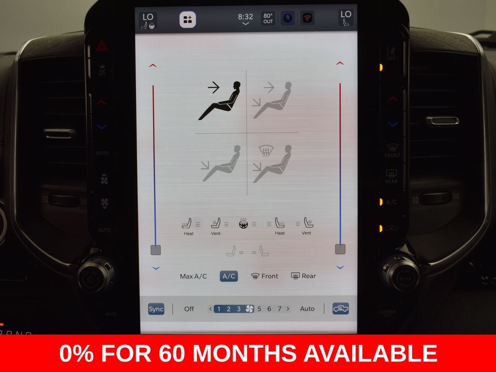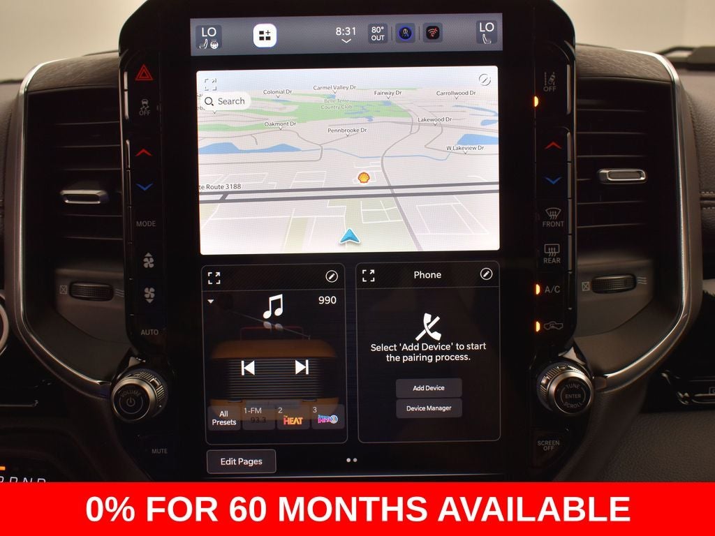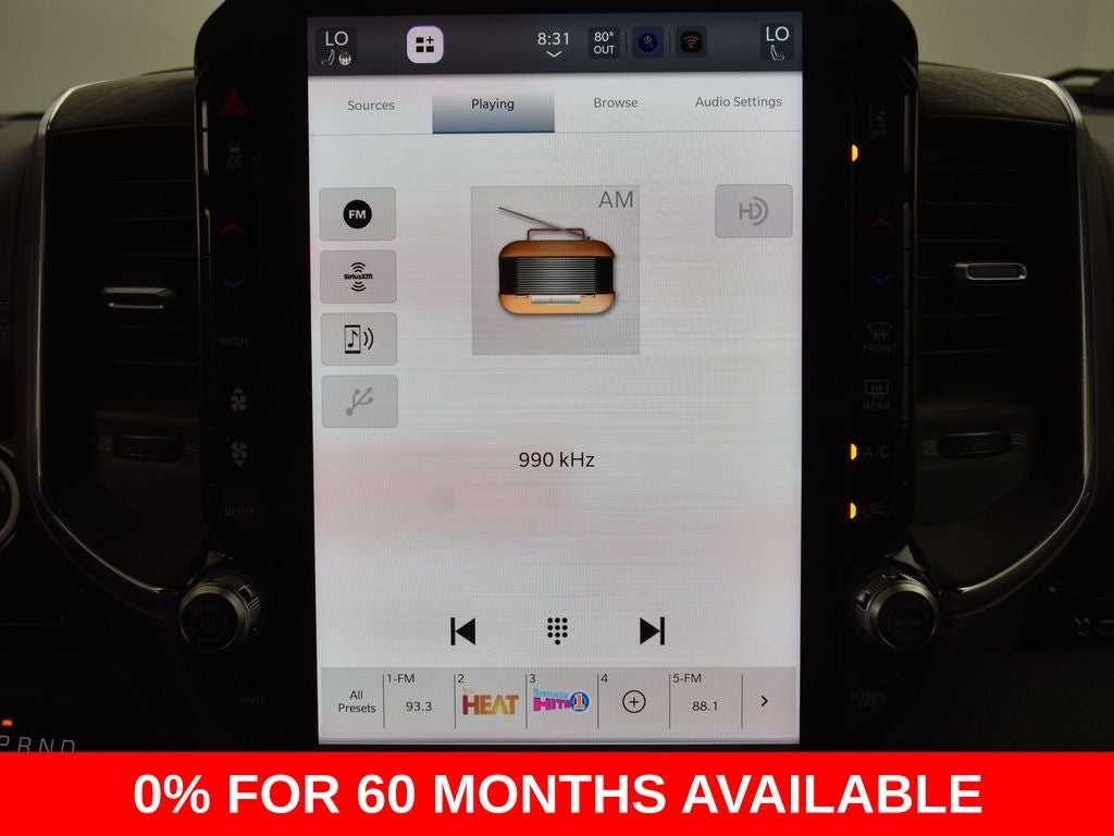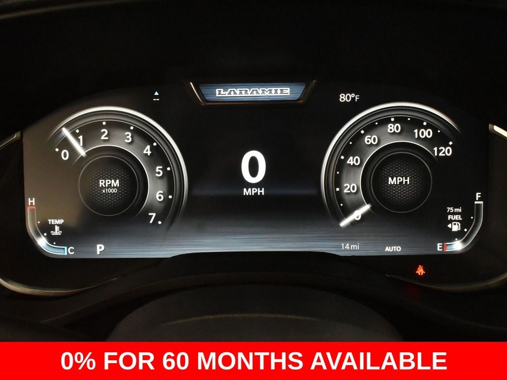 1500 Laramie Night Edition, 4D Crew Cab, 3.0L I6, 8-Speed Automatic, 4WD, Diamond Black Crystal Pearlcoat, Black w/Leather Trimmed Bucket Seats, 14.4 Touchscreen Display, 4-Wheel Disc Brakes, 4G LTE Wi-Fi Hot Spot, ABS brakes, Accent Color Door Handles, Accent Color Premium Power Mirrors, Accent Color Tailgate Handle, Air Conditioning, Alloy wheels, Anti-Spin Differential Rear Axle, Apple CarPlay, Apple CarPlay/Android Auto, Auto Power-Folding Mirrors, Auto-Dimming Exterior Driver Mirror, Black Exterior Truck Badging, Black Headlamp Bezels, Black Interior Accents, Black Painted Exterior Mirrors Caps, Black Tail Lamp Bezels, Body Color Front Bumper, Body Color Rear Bumper w/Step Pads, Cluster 12 TFT Color Display, Connected Travel & Traffic Services, Connectivity - US/Canada, Convex Wide-Angle Exterior Mirror Insert, Disassociated Touchscreen Display, Dual Exhaust w/Black Tips, Dual front impact airbags, Dual front side impact airbags, Dual Wireless Charging Pad, Exterior Mirrors Approach Lamps, Exterior Mirrors Courtesy Lamps, Exterior Mirrors w/Heating Element, Exterior Mirrors w/Memory, Exterior Mirrors w/Supplemental Signals, Front Passenger Interactive Display, Global Telematics Box Module (TBM), Google Android Auto, GPS Antenna Input, GPS Navigation, Grille Surround 3 Black Texture 2 Black, harman/kardon 19 Speaker Premium Sound, HD Radio, Heated front seats, Heated rear seats, Integrated Center Stack Radio, Integrated Voice Command w/Bluetooth®, Laramie Level 2 Equipment Group, Leather steering wheel, Low tire pressure warning, Night Edition, Outside temperature display, Pirelli Brand Tires, Power door mirrors, Power driver seat, Power steering, Power Tailgate, Power windows, Proximity Approach/Departure Lamps, Quick Order Package 21H Laramie, Radio: Uconnect 5 Nav w/14.4 Display, Rain Sensitive Windshield Wipers, RAM Grille Badge - Black, Remote keyless entry, Secondary Active Grille Shutters, SiriusXM Radio Service, SiriusXM w/360L, Smartphone As A Key Capable, Sport Performance Hood, Steering wheel mounted audio controls, USB Host Flip, Ventilated front seats, Wheels: 22 x 9 Forged Aluminum.