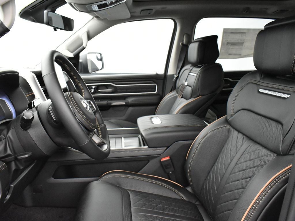 1500 Tungsten, 4D Crew Cab, 3.0L I6, 8-Speed Automatic, 4WD, Diamond Black Crystal Pearlcoat, Black w/Leather Trimmed Bucket Seats, 4-Wheel Disc Brakes, ABS brakes, Active Cruise Control, Adjustable pedals, Air Conditioning, Alloy wheels, AM/FM radio, Apple CarPlay/Android Auto, Audio memory, Auto High-beam Headlights, Automatic temperature control, Compass, Dual front impact airbags, Dual front side impact airbags, Exterior Parking Camera Rear, Front dual zone A/C, Front fog lights, Heads-Up Display, Heated door mirrors, Heated front seats, Heated rear seats, Heated steering wheel, Leather steering wheel, Low tire pressure warning, Memory seat, Outside temperature display, Panic alarm, Pedal memory, Power door mirrors, Power driver seat, Power moonroof, Power steering, Power windows, Quick Order Package 22V Tungsten, Radio data system, Radio: Uconnect 5 Nav with 14.4 Display, Rear window defroster, Remote keyless entry, Security system, Steering wheel mounted audio controls, Tilt steering wheel, Ventilated front seats, Wheels: 22 x 9 Polish/Painted with Inserts.