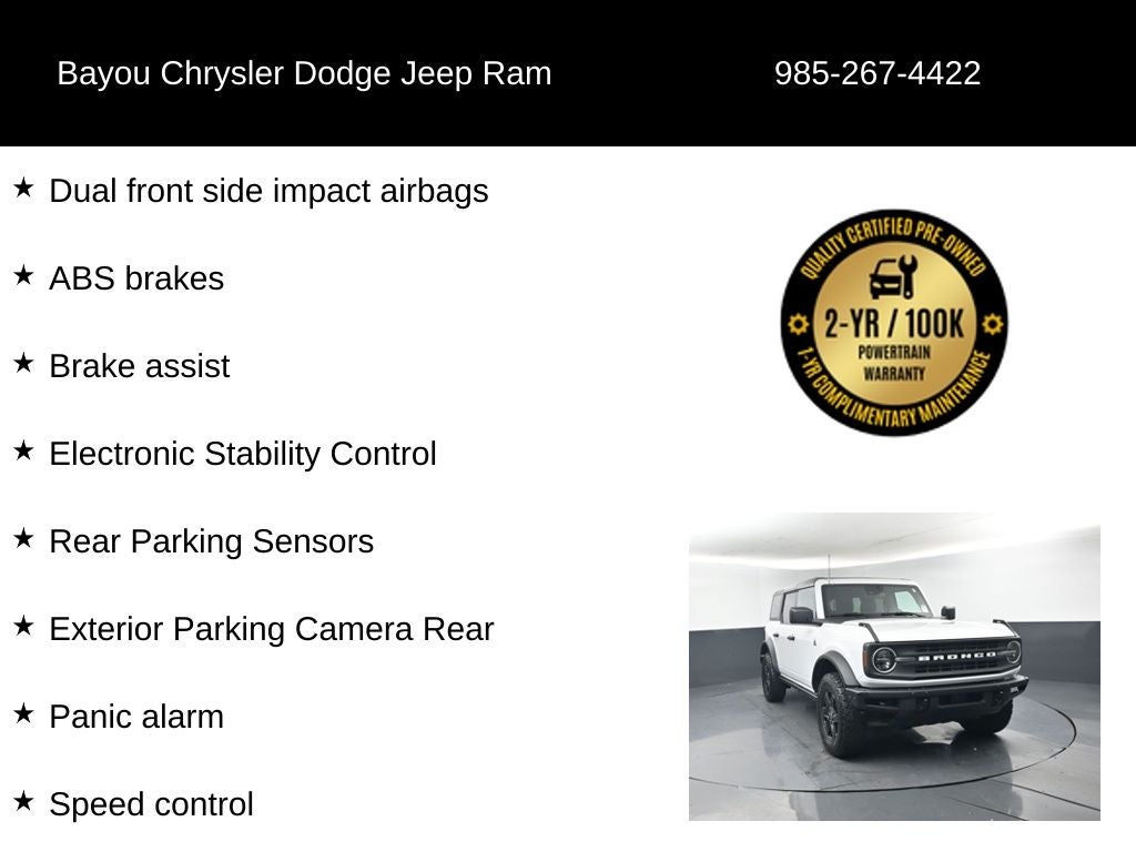 4D Sport Utility, 2.3L EcoBoost I-4, 4WD, 2-Door Intelligent Access w/Lock/Unlock, 4-Wheel Disc Brakes, 6 Speakers, ABS brakes, Air Conditioning, Alloy wheels, Ambient Footwell Lighting, Auto-Dimming Interior Rear-View Mirror, Brake assist, Compass, Connected Navigation, Dr & Pass Illuminated Sliding Visor Vanity Mirrors, Dual front impact airbags, Dual front side impact airbags, Dual-Zone Electronic Automatic Temperature Control, Electronic Stability Control, Enhanced Voice Recognition, Equipment Group 322A Mid Package, Exterior Parking Camera Rear, Front Bucket Seats, Front Row Heated Seats, Heated door mirrors, Illuminated entry, Low tire pressure warning, Outside temperature display, Panic alarm, Power door mirrors, Power Outlet - Back Side of Center Floor Console, Power steering, Power windows, Radio data system, Rear Parking Sensors, Remote keyless entry, Remote Start System, Speed control, Steering wheel mounted audio controls, Tilt steering wheel, Traction control, Wheels: 17 Black High Gloss-Painted Aluminum (64H).