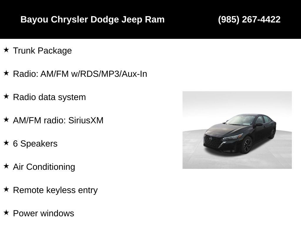 Sentra SV, 4D Sedan, 2.0L I4 DOHC, CVT with Xtronic, FWD, Super Black, Charcoal Cloth, 16 Alloy Wheels, 4-Wheel Disc Brakes, 6 Speakers, ABS brakes, Air Conditioning, Alloy wheels, AM/FM radio: SiriusXM, Blind Spot Warning, Brake assist, Dual front impact airbags, Dual front side impact airbags, Electronic Stability Control, Hide-A-Way Trunk Net, Leather steering wheel, Low tire pressure warning, NissanConnect featuring Apple CarPlay and Android Auto, Outside temperature display, Panic alarm, Power door mirrors, Power steering, Power windows, Radio data system, Radio: AM/FM w/RDS/MP3/Aux-In, Rear Parking Sensors, Remote keyless entry, Speed control, Steering wheel mounted audio controls, Tilt steering wheel, Trunk Package.