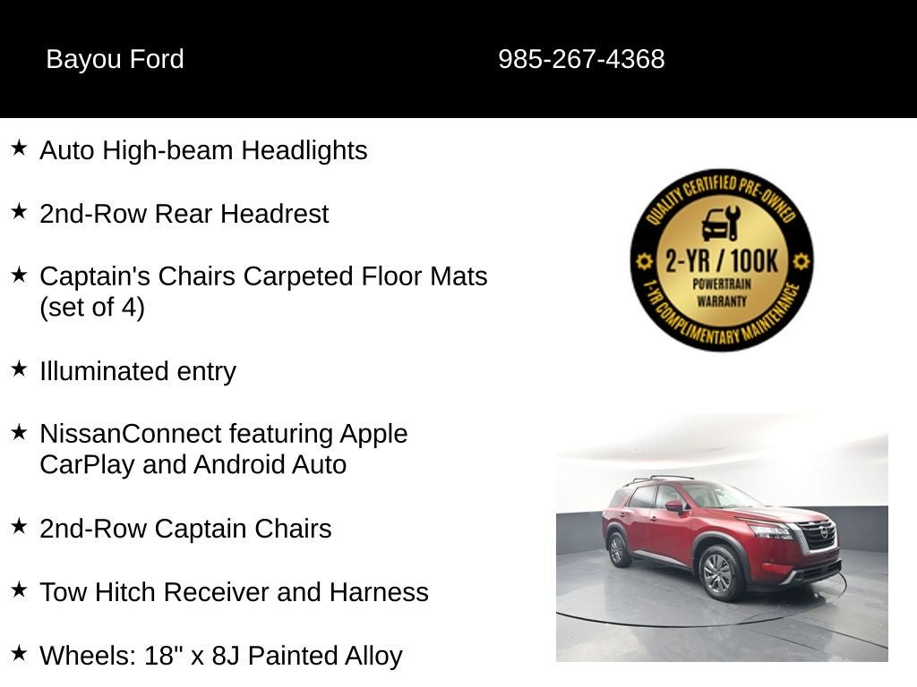The Pathfinder's spacious and comfortable interior is highlighted by the SV Premium Package, which includes a panoramic moonroof, power liftgate, and second-row captain's chairs. The NissanConnect infotainment system with Apple CarPlay and Android Auto integration ensures you stay connected and entertained on the road. Safety features like automatic high-beam headlights and rear parking sensors provide added peace of mind.